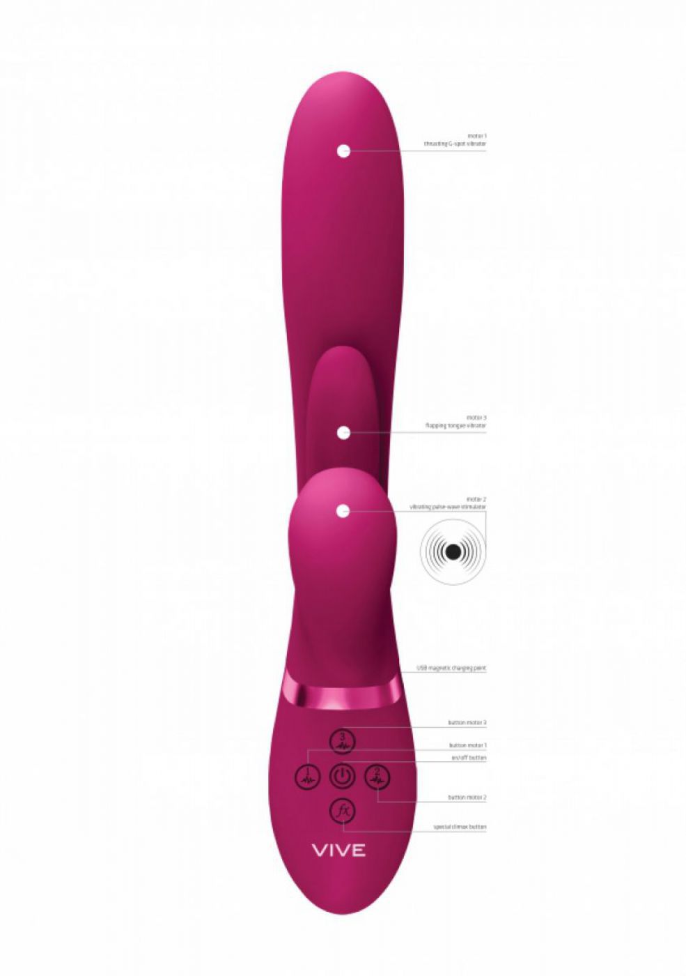 Rabbit δονητής με τρία ανεξάρτητα μοτέρ F1 νέας γενιάς 10 λειτουργιών. Με τρία στελέχη διαφόρων και ανεξάρτητων λειτουργιών. Το κύριο στέλεχος έχει λειτουργία ώθησης, το γλωσσάκι έχει παλινδρομική κίνηση και το κάτω στέλεχος προσφέρει παλμικά κύμματα για κλειτοριδική διέγερση. Είναι κατασκευασμένο από υποαλλεργική απαλή σιλικόνη και έχει αδιάβροχη λειτουργία. Με μαγνητική επαναφορτιζόμενη μπαταρία λιθίου που φορτίζει με το παρεχόμενο καλώδιο USB (60 λεπτά συνεχόμενης λειτουργίας). Πατώντας το ει