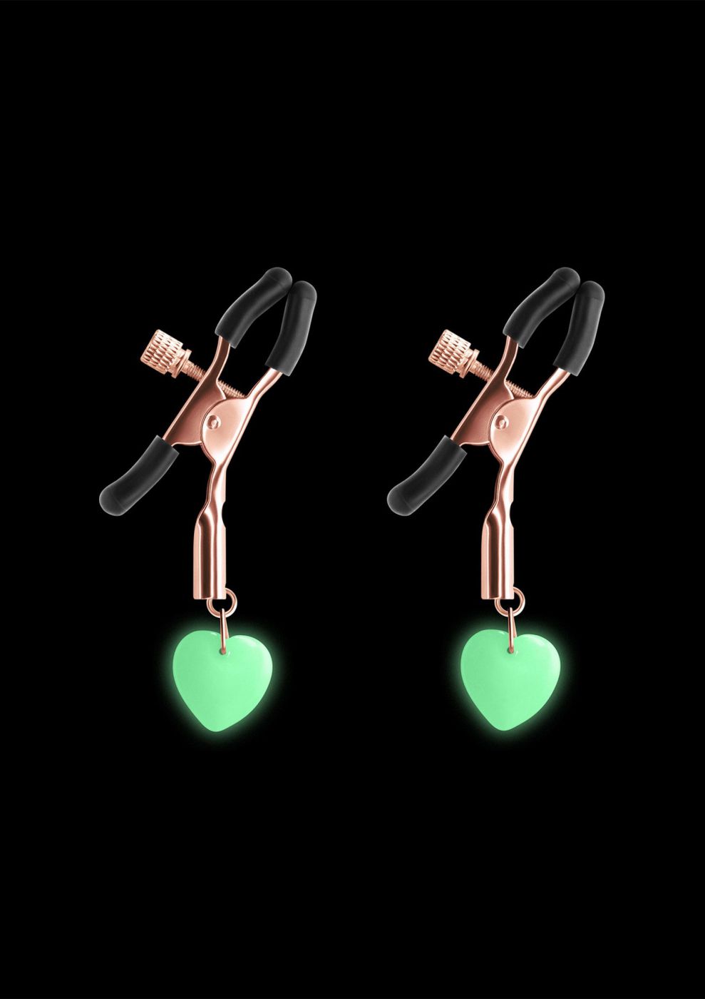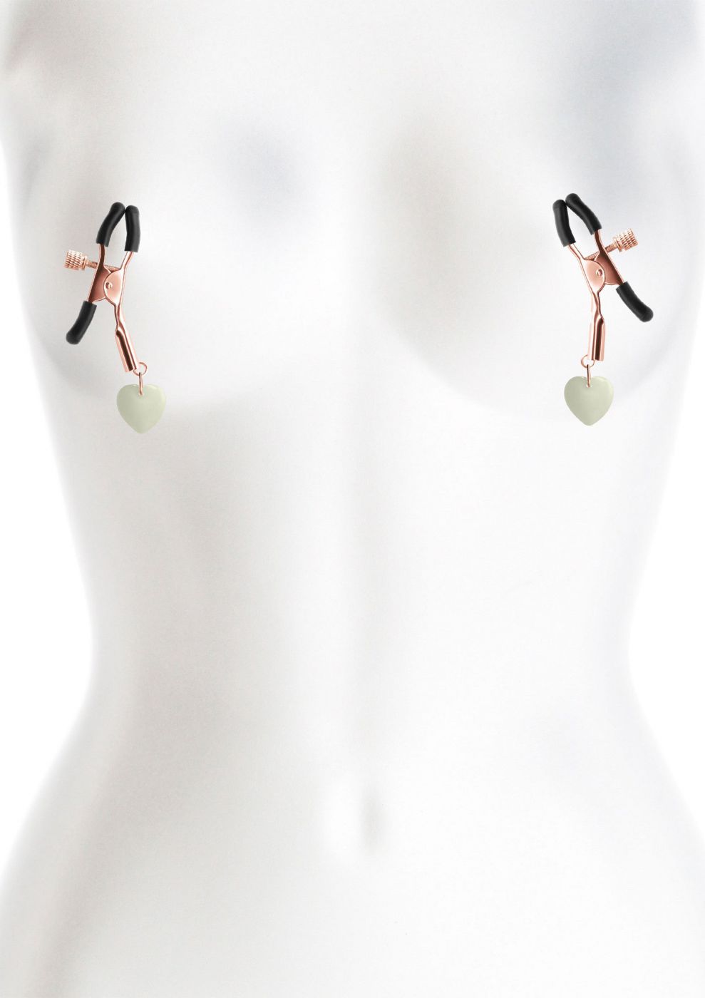 Ρυθμιζόμενοι σφιγκτήρες θηλών σε χρυσό χρώμα, με διακοσμητική καρδούλα που λάμπει στο σκοτάδι. Οι σφιγκτήρες είναι κατασκευασμένοι από μέταλλο (χωρίς Νικέλιο) και έχουν καλύμματα σιλικόνης στις άκρες. Η πίεση στις θηλές μπορεί εύκολα να ρυθμιστεί με τις ενσωματωμένες βίδες.