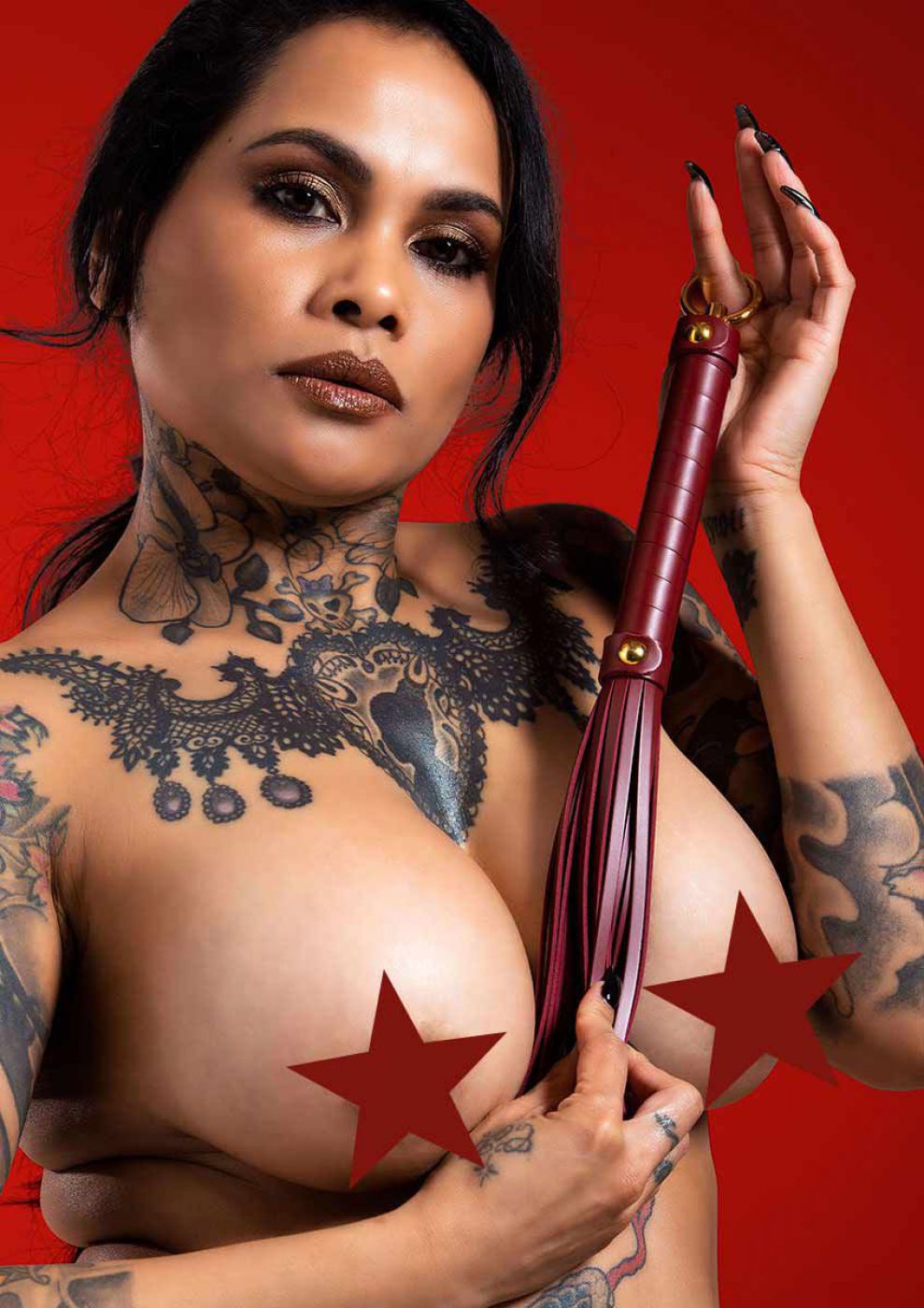 Μικρό πανέμορφο μαστίγιο με απαλές ουρές. Λαβή με χρυσό κρικάκι. Για αγγίγματα τύπου S/M. Υλικό: Δερματίνη, μεταλλικό. 30 εκ.